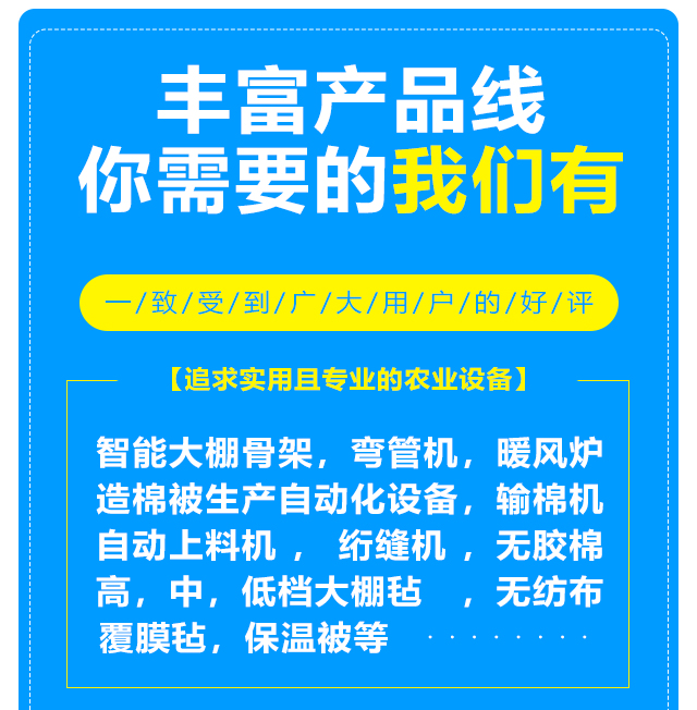 本公司設備齊全,可生產智能大棚骨架,彎管機,暖風爐等農業設備,另制造棉被生產自動化設備,自動上料機,輸棉機,絎縫機等。質量可靠,注重創新。公司擁有雄厚的實力,先進的生產線,豐富的經驗,可根據客戶的要求定做高,中,低檔大棚氈,無紡布,無膠棉,覆膜氈,保溫被等,車間日生產新型棉被10000平方米以上,能滿足各種客戶的需求,新型保溫被產品在國內研發中始終保持在前列。